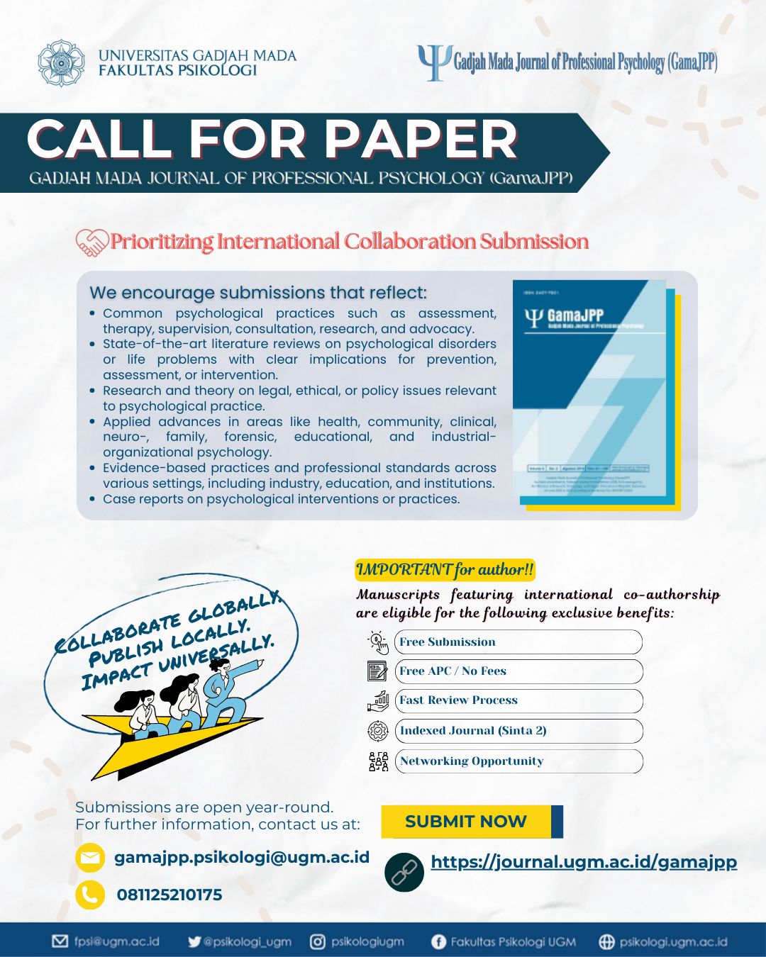 We are happy to announce that Gadjah Mada Journal of Psychology (GamaJoP) has been accredited as a Sinta 2 journal by National Journal Accreditation (ARJUNA) starting from Vol. 6 No. 2 (2020). We are also currently preparing to be indexed internationally. With the spirit of delivering better publication quality, a few changes have been implemented in the publication process.