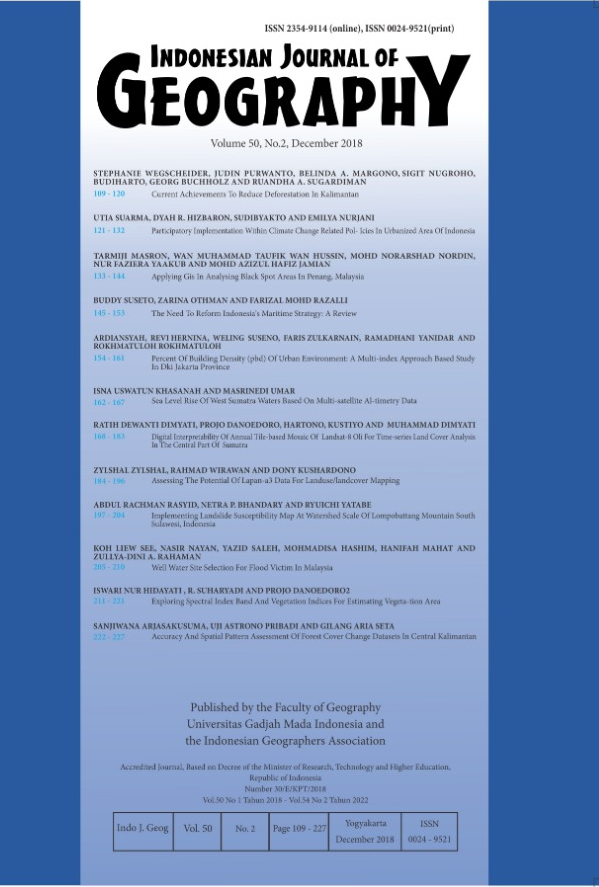 The Indonesian Journal of Geography (ISSN 2354-9114 (online), ISSN 0024-9521 (print)) is an international journal published by the Faculty of Geography, Universitas Gadjah Mada in collaboration with The Indonesian Geographers Association. The content of this website is licensed under a Creative Commons Attribution-ShareAlike 4.0 International License