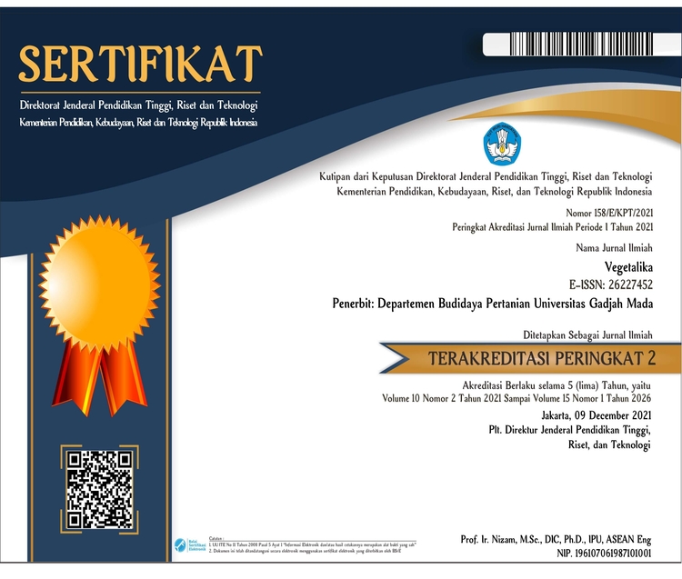 Vegetalika was officially accredited with SINTA 3 (S3) status in 2017, based on the Decree of the Director General of Research and Development Strengthening, Ministry of Research, Technology, and Higher Education, Number 34/E/KPT/2018, effective from Volume 6, Number 1 (2017) to Volume 10, Number 4 (2021). The official accreditation certificate for Vegetalika is listed under Decree Number: SK No. 30/E/KPT/2018.